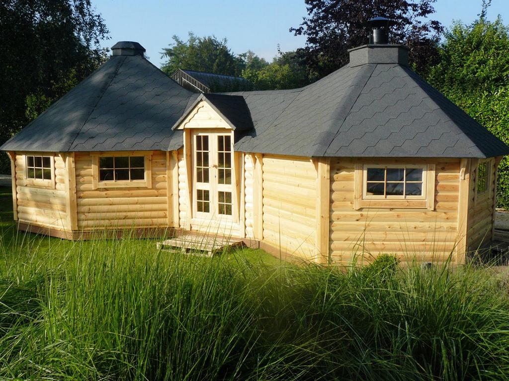 Die Hütte verfügt über gerade Wände und ist mit Bitumenschindeln gedeckt, um einen zuverlässigen Schutz vor Witterungseinflüssen zu bieten. Eine Standard-Grillkabinentür mit Schloss im Flur ermöglicht den einfachen Zugang zur Hütte. Bitte beachten Sie, dass Grill, Bänke und zusätzliche Innenwände nicht im Standardset enthalten sind und separat bestellt werden müssen.