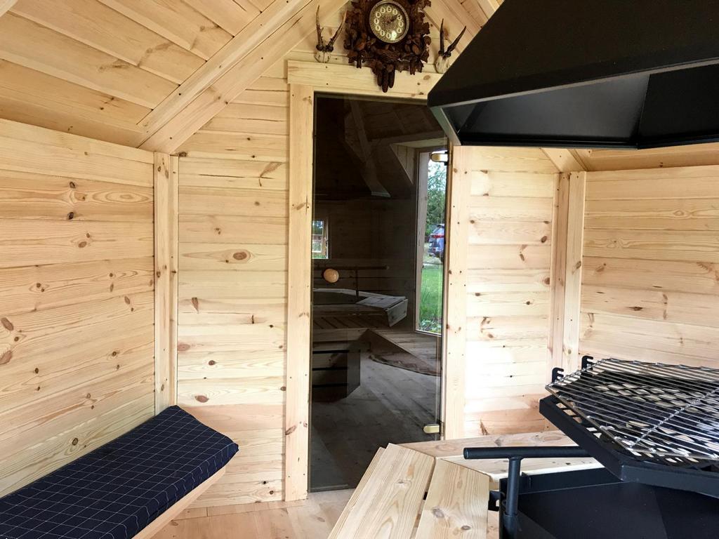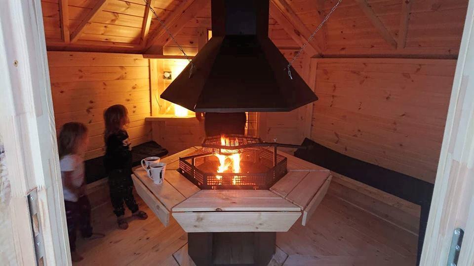 Die Grillkota verfügt über zwei Räume - einen BBQ-Raum und einen Saunaraum. Der BBQ-Raum ist mit einem zentralen Standard-Grill und einem Tisch um den Grill herum ausgestattet. Es gibt vier Bänke, von denen zwei für zusätzlichen Schlafplatz ausgezogen werden können. Der Saunaraum ist mit einer hexagonalen Fenster, Innenbänken und hitzebeständigen Platten für den Ofen ausgestattet.