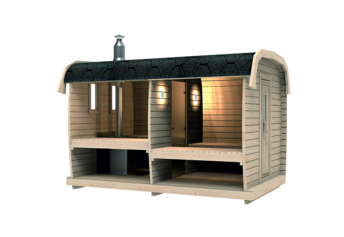 Das Dach ist mit langlebigen Bitumenschindeln gedeckt, die vor den Elementen schützen. Die Außentür ist eine stabile Holztür (700 x 1800 mm), und die Saunatür besteht aus gehärtetem Glas (620 x 1750 mm). Die doppelt verglasten Fenster (295 x 580 mm) und das Pavillonfenster (1020 x 1060 mm) sorgen für eine helle, einladende Umgebung.