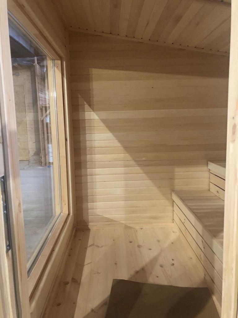 Die Sauna verfügt über isolierte Bodenplatten und eine doppelt verglaste Tür mit einem Holzgriff für ein komfortables und sicheres Nutzungserlebnis. Die Dachpaneele sind mit dunkelbraunen bituminösen Dachbahnen bedeckt, die eine zuverlässige Witterungsbeständigkeit gewährleisten.